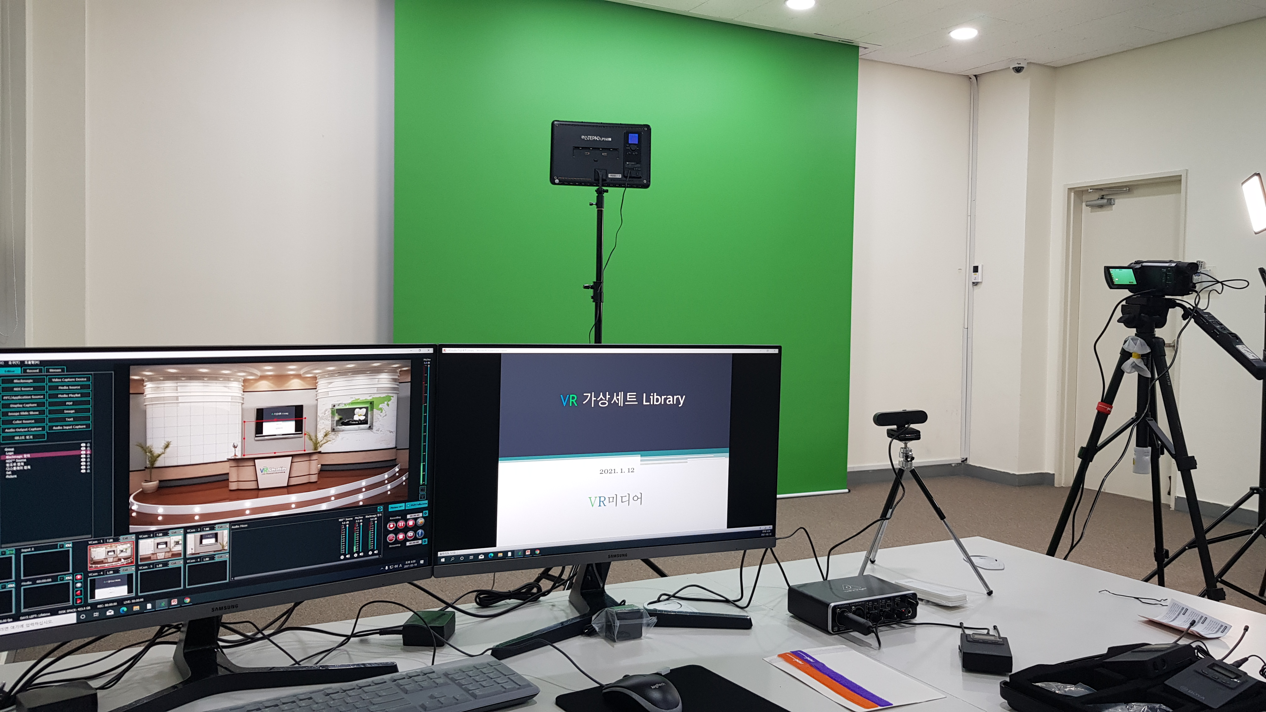 (주)브이알미디어 사는 한국어린이안전재단 송파구안전체험교육관에 Zoom줌 등의 온라인비대면 화상회의SW플랫폼과 연동운영이 가능한 가상스튜디오 제품인 VRStudio-K시스템를 납품.구축하였습니다. 이 장비는 기존 제공되는 가상세트 외에 교육목적에 맞는 DIY버추얼세트를 직접 제작하여 각종 안전교육컨텐츠 촬영, 관내 학생들의 체험 및 각종 회의 및 세미나, 온라인화상교육 등에 활용될 예정이며 일반적으로는 3개의 모니터(오퍼레이팅, 줌(또는 PPT) 24형모니터와 PPT판서용 태블릿) 운영하나 이 곳은 5개의 모니터를 연결하여 구축하였습니다.